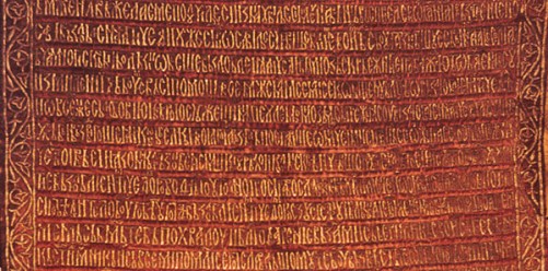 Плаштаница краља Милутина на којој се испод тела умрлог Христа налази ктиторски запис: ”Помјани Боже душаја раба својего Милутина Уреши” (“сети се Боже душе слуге своје Милутина Уроша”) је такође извезена златним и сребрним нитима на црвеној свили.