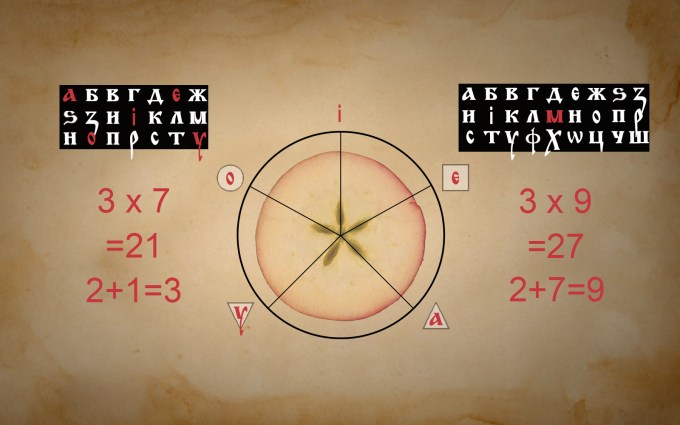 Азбучни низ от А до У сачињава 21 слово или скуп от 3×7 слова где се слово I налази у средини. 3×7=21, 2+1=3. Када на овај низ додамо остатак азбучних слова (не рачунајући носне и тврде самогласнике који представљају варијације основних самогласника осим самогласника ω или лигатуре ѿ) добијамо 27 слова или скуп от 3×9 слова где се слово М налази у средини. 3×9=27, 2+7=9.