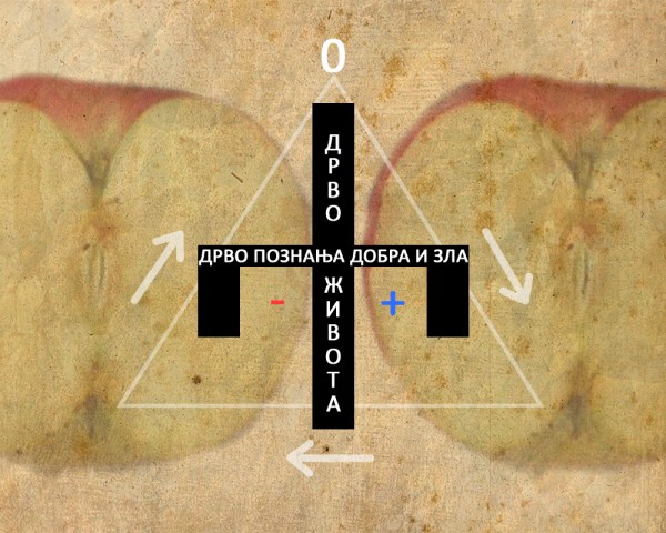 Све што постоји, све што је створено, може то бити само у односу на своју супротност. Створени свет – Земља може бити нешто само у односу на ништа нестворене и свеобухватне вечности духа из које је свет створен. У том смислу дух (вечност) и тело (Земља) су супротности и то је вертикална поларност Дрвета Живота. Међутим да би сам живот на Земљи био могућ и он мора имати своје супротности – своје ништа у односу на шта би био нешто. Стога и на хоризонтали времена – на Земљи, имамо супротности светла и таме, прошлости и будућности, гора и долина, висина и дубина, топлоте и хладноће – другачије речено – добра и зла. Стога добро (+) и зло (-) створеног света стоје као супростављена начела материје која произилази из вечности духа која материјалну поларност помирује и надилази (0). Зато је Бог тројединствен или представљен као три личности, јер без ова три квалитета нема ни творевине (па отуд ни Творца). Поларност материјалног света (Земље) односно хоризонтале времена, представљена је као Дрво Познања Добра и Зла.