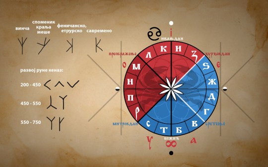 Зодијачки знак Рака и слово Како налазе се не врхунцу године који годину дели на две вертикалне половине. Узлазну половину године (од јануара до јуна) симболизује елемент ватре јер се тада Сунце подиже на небу и јача (ватра гори на горе), док силазну половину године (од јула до децембра) симболизује елемент воде – препуштајућа сила која гаси ватру (вода лије на доле). Ова симболика је пренета у хришћанство на ликове Исуса Христа (ватра) чији је рођендан на почетку узлазне половине године (Божић) и Јована Крститеља (вода) чији је рођендан на почетку силазне половине године (Ивањдан). У старој словенској вери ову симболику носе браћа Коледо и Купало или по руском предању близанци Купало (вода) и Кострома (ватра). Две стране године се сједињују једном на дугодневницу и други пут на краткодневницу, дакле на вертикали календарског крста (I). Време летњег сједињења године окружују зодијачки знаци Близанци и Рак. Дакле слово К као и зодијачки знак Рака симболизују воду односно силазну половину године и полове уопште, слично као што и знак Близанаца (и слово Иже) који пада десно од дугодневнице на крају узлазне половине симболизује узлазну половину (слово И у старим писмима представља и мердевине).