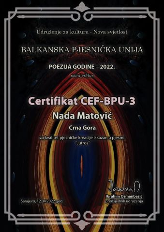 Мала птица певалица из Берана, Нада Матовић, крхког тела, драгуљасто-жарних очију и просветљеног, дивовски јаког песничког духа, на почетку је велике песничке каријере. Јасновидим и јаснознам, у времену будуће-садашњем, биће још пуно њених остварења – поетских, приповедачких и збирки мудрица-силница.