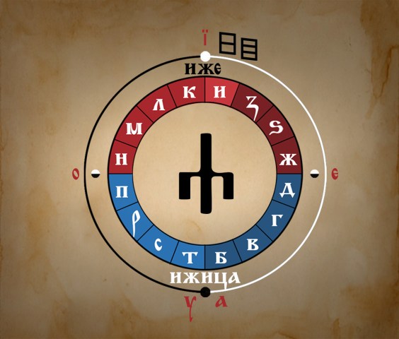 На врху Азбучног Кола Године налази се слово ИЖЕ. На дну Азбучног Кола Године налази се слово УК или другачије названо ИЖИЦА – у каснијем читању као И представља мало ИЖЕ – ИЖИЦУ. У календарском смислу ова два слова означавају врхунац сунчеве енергије (ИЖЕ) и њен патос када се рађа нова Година које са наново пење ка врхунцу, која васкрсава (ИЖИЦА). ИЖЕ и ИЖИЦА у овом относу стоје као Бог и Божић или Сварог (Вид, Kупало) и Сварожић (Коледо).